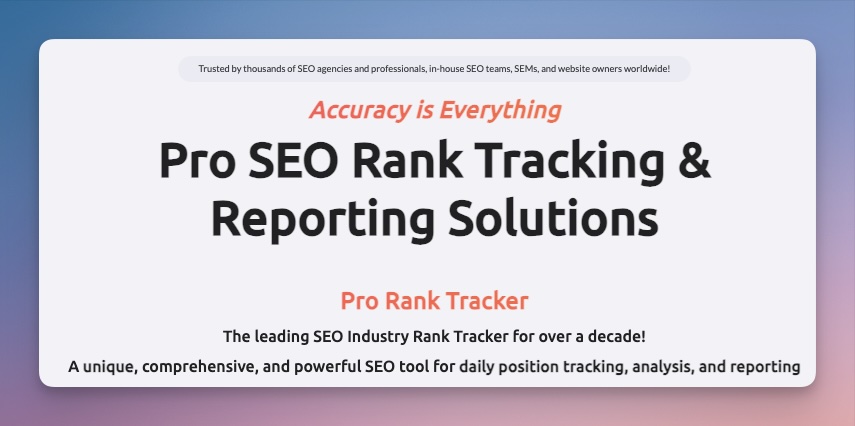 Pro Rank Tracker is an affordable rank tracking tool starting at $13.50/month for 100 keywords. It features white-label reporting and automated scheduling, making it ideal for agencies.